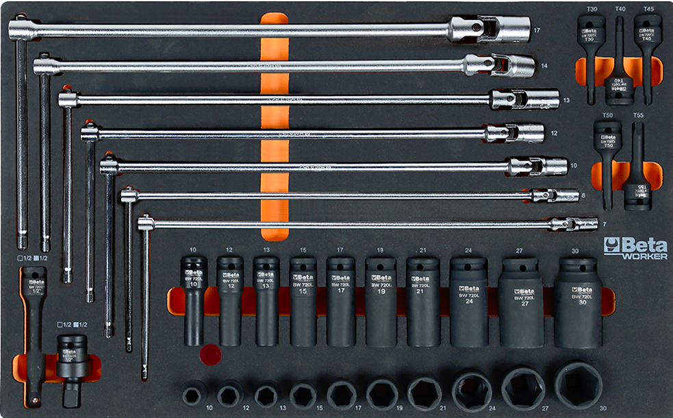- Chiavi a bussola esagonali 1/2″: 8-9-10-11-12-13-14-15-16-17-18-19-20-21-22-23-24-27-30-32 mm.