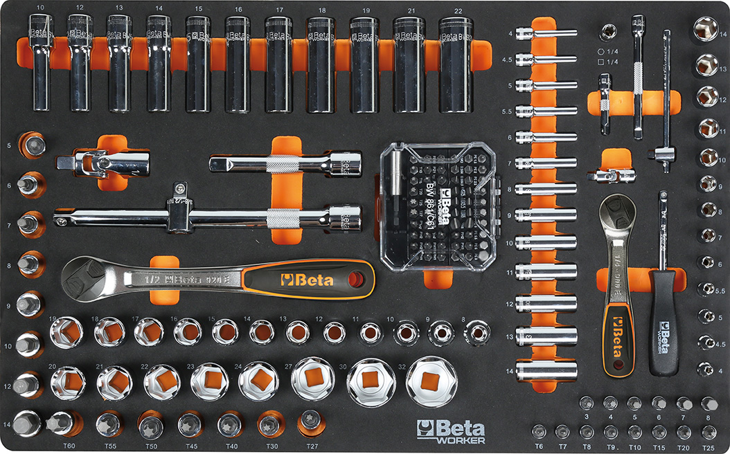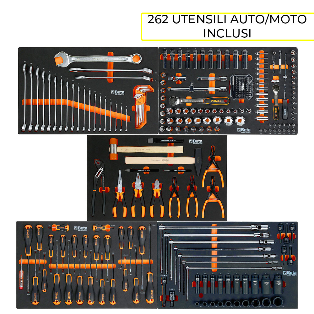 Allestimento composto da 262 utensili selezionato per ambiente Automotive, ideale per l’impiego in officine meccaniche auto e moto, della linea Beta Worker.
