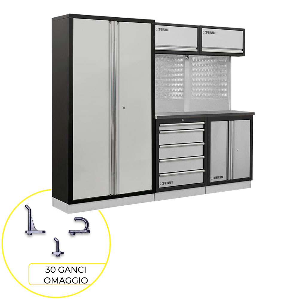 L’ arredamento modulare Fervi è la soluzione perfetta per arredare la tua officina, che tu sia un amatore o un professionista l’officina dei tuoi sogni è qui ad aspettarti ed è completamente personalizzabile. Per te in regalo un set di 30 GANCI ASSORTITI PER PARETE PORTA UTENSILI.