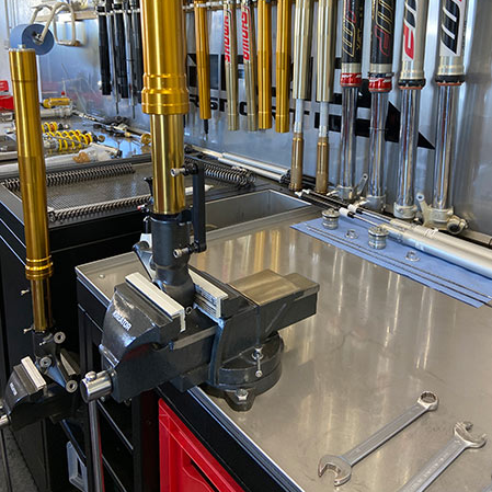 - Piano in acciaio inox con morsa per lo smontaggio di forcelle e sospensioni.