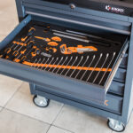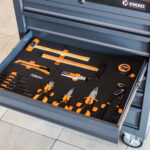 Comoda cassettiera mobile con 6 ampi cassetti di colore Nero, completa di 196 utensili assortiti e selezionati appositamente per l’ambiente Automotive, alloggiati in termoformati morbidi in EVA, creando un ambiente di lavoro più ordinato. Dotata di 4 ruote con freno meccanico.