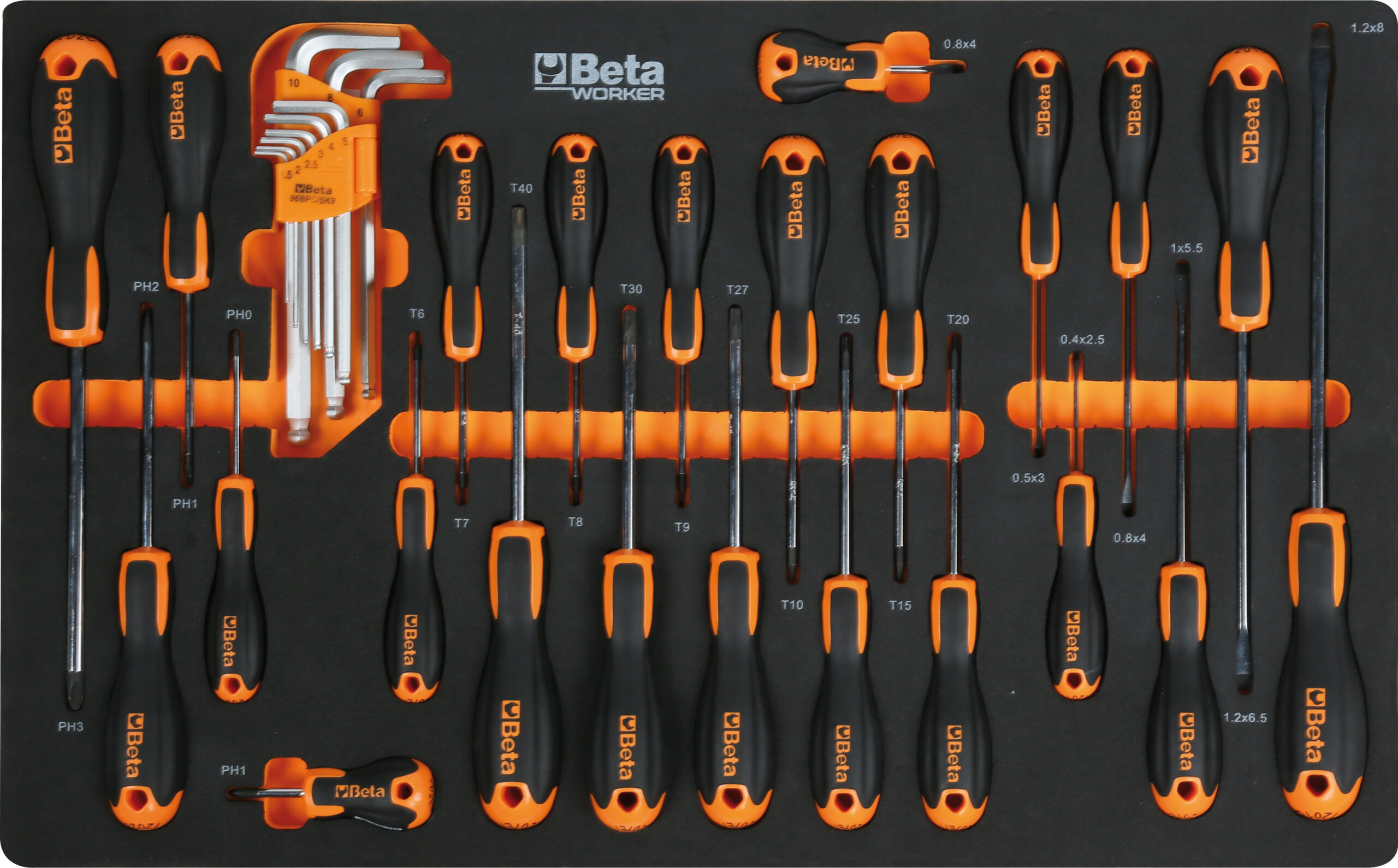 - chiavi maschio con impugnatura per viti con impronta Torx®: T6-T7-T8-T9-T10-T15-T20-T25-T27-T30-T40.