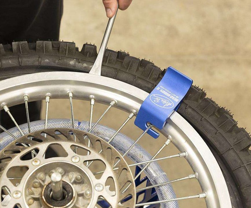 Attrezzo per montaggio pneumatici off-road e mousse, facilità notevolmente l’inserimento dello pneumatico all’interno del cerchio. Agganciandosi al raggio crea una leva che spinge il tallone verso il centro del cerchio mantenendolo fermo durante la manovra di tallonatura.