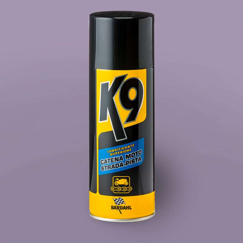 Il lubrificante K9 per catena moto stradali e da pista è un grasso spray ad alta adesività, studiato per proteggere e lubrificare tutti i tipi di catene, con o senza O-ring e X-ring.