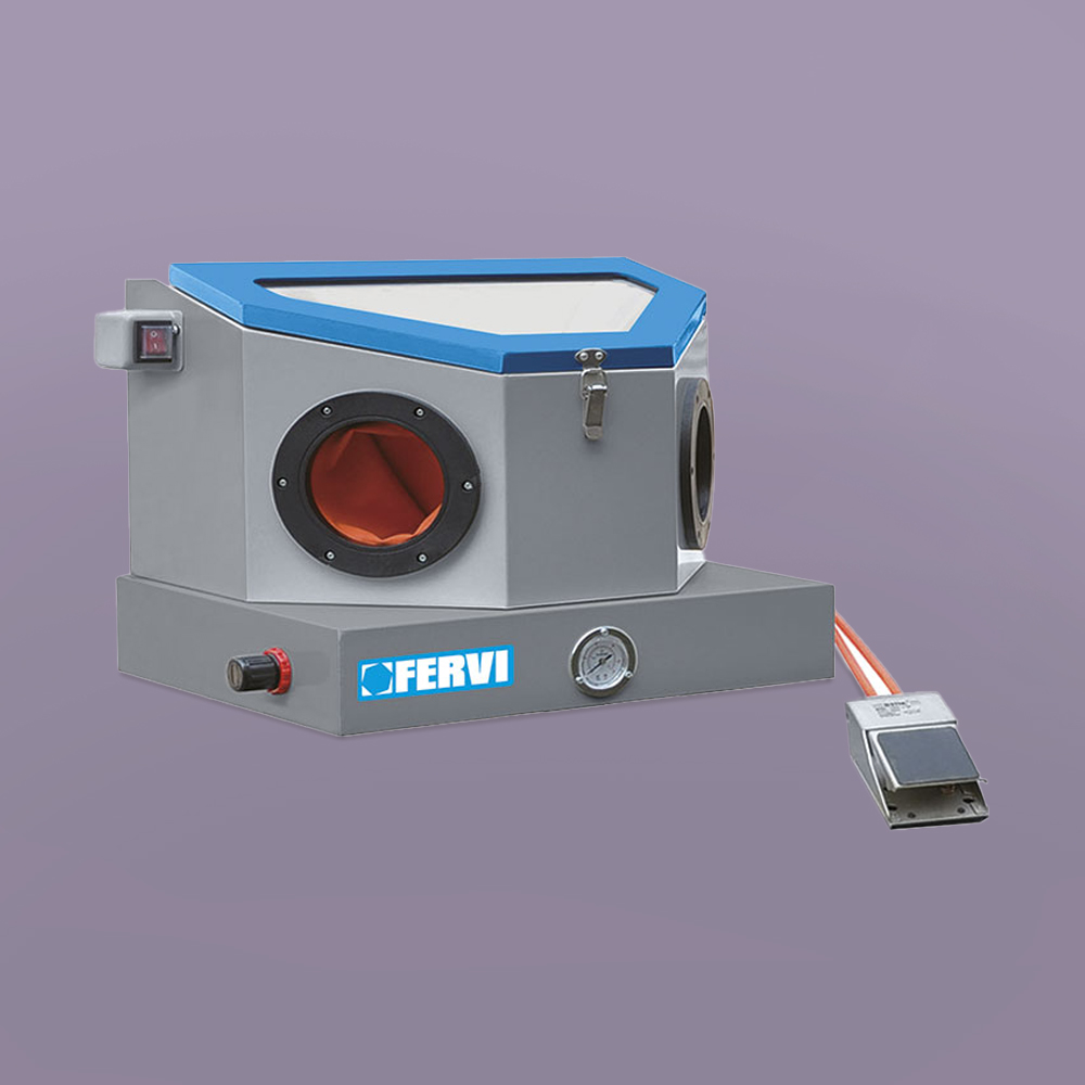 - La mini sabbiatrice da banco professionale 0490 di Fervi è stata costruita per pulire e satinare piccoli pezzi metallici tramite un flusso in pressione di particelle abrasive secche, come granuli di vetro o granuli di pietra abrasiva.
