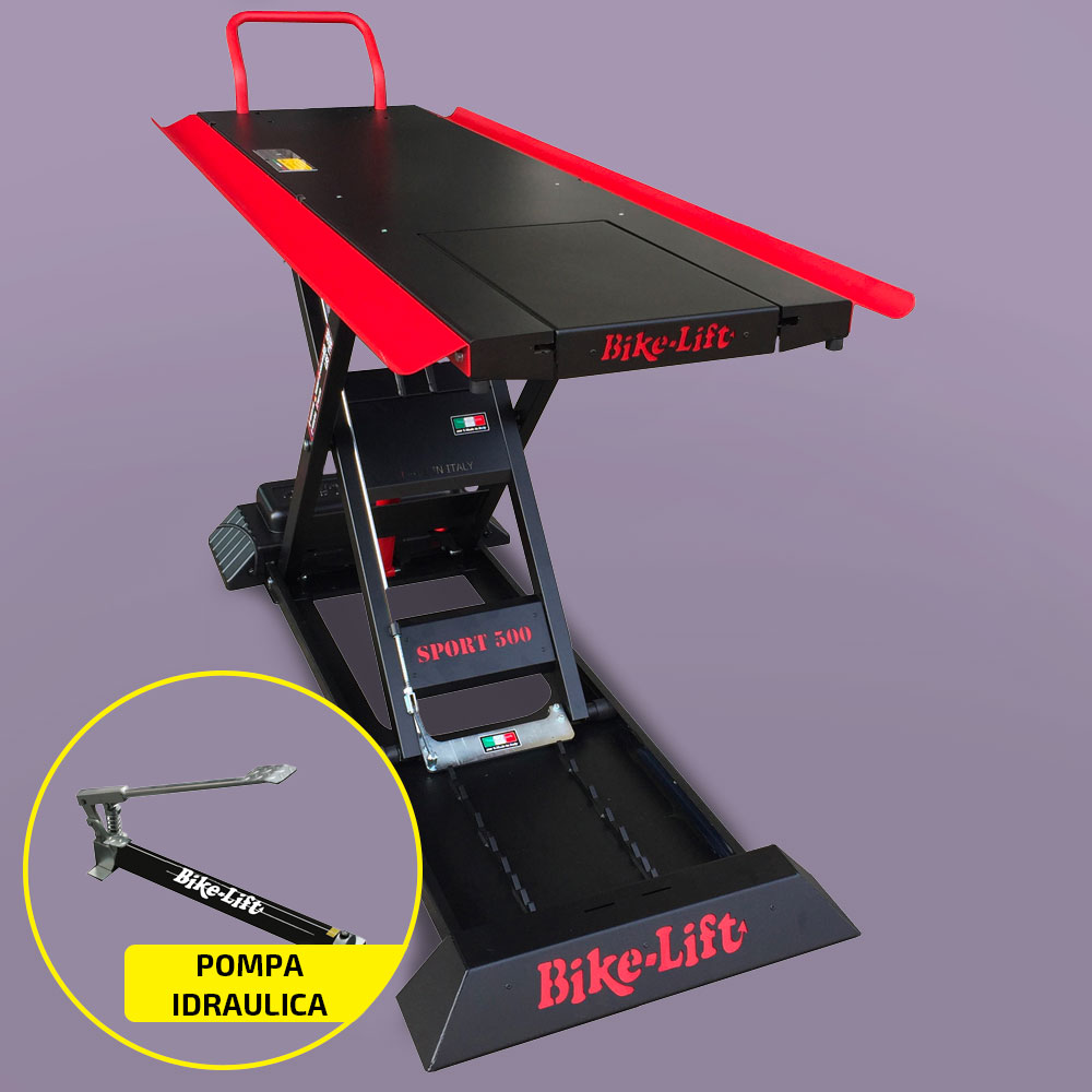 Ponte sollevatore moto Sport Gate 500/17 Bike-Lift a pompa idraulica manuale con botola posteriore a caduta, portata 500kg.